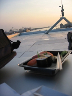 Ich fahre am 29.7 durch den Hafen und entdecke eine schöne Tour: Bei der Sushi-Factory ein Lunch-Pack ein und steige aufs neue Dockland-Haus.
