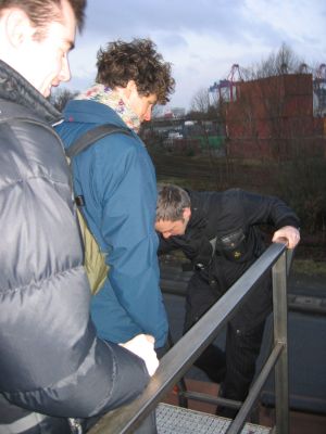 Jetzt geht's richtig ab: Sturmflut und die Schutzmaßnahmen greifen: Fluttore zu und wir steigen über Hilfsleitern in den Hafen; am Tollerort steht die Elbe schon fast bis zum Kairand.