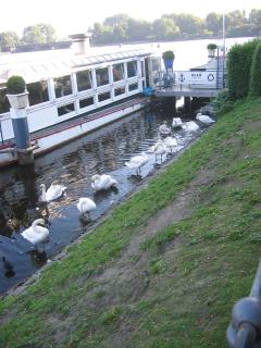 Meine neue Route ist geil: I call it "The scienic urban jungle route": Umgestürzte Bäume im Flußbett, dicht bewachsene Uferstraße und dann an der Alster mit den Alsterschwänen entlang.