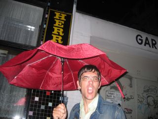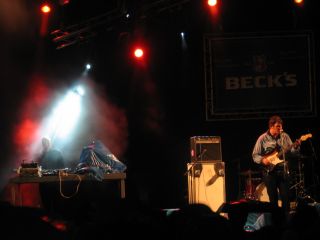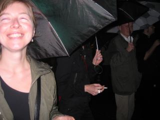 Mit Nina (die Hand mit der Zigarette) und noch 2 Bekannten aus der Buchhandlung sehe ich zum ersten Mal Superpunk auf der Bühne, es regnet und ist windig, aber trotzdem sehr lustig und laut und schön: