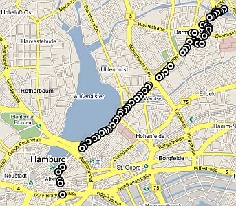 Abends auf der Fähre den GPS-Logger angeworfen und losgeradelt, hier also der Weg quer durch Haaaamburg Ciddi.