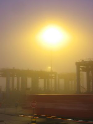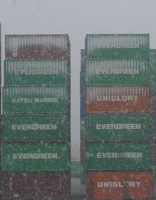 Selbst der tägliche Arbeitsweg wird im Winter zur Poesie: Glühender Sonnenaufgang an den Landungsbrücken, schneebedeckte Containerstapel, LKWs im Abendlicht.