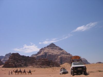 Am südlichsten Punkt sind wir im Wadi Rum, einer aufregenden Mischung aus Wüste und fast 2000m hohen Bergen, alles in rotes Licht getaucht und mit reichlich Geschichte versehen - Lawrence von Arabien hat sich hier vor den Türken versteckt. Das letzte Bild zeigt die von ihm als Titel für seine Memoiren benutze Felsformation "Sieben Säulen".